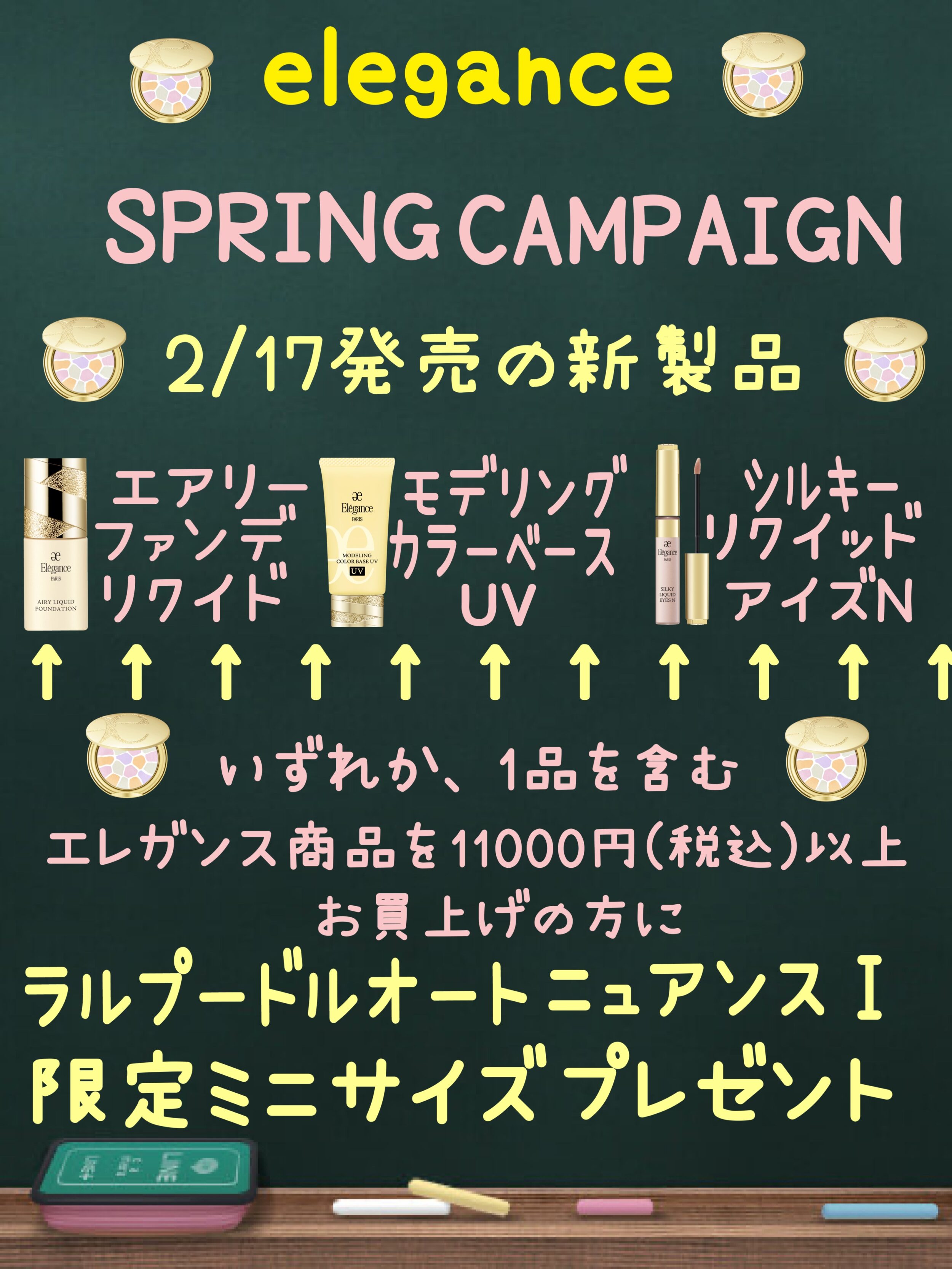 こんばんは♪( ´▽`) いつもご覧いただきありがとうございます♡ 本日は2/17スタート エレガンス スプリングキャンペーンのご案内です 2/17発売 🌸エアリーリクイッドファンデーション 🌸モデリングカラーベースUV 🌸シルキーリクイッドアイズNの エレガンス商品いずれかを含む、11000円以上お買上げの方に ラプードルオートニュアンスⅠの限定ミニサイズプレゼント🎁 無くなり次第終了となりますので、お早めにどうぞ♡