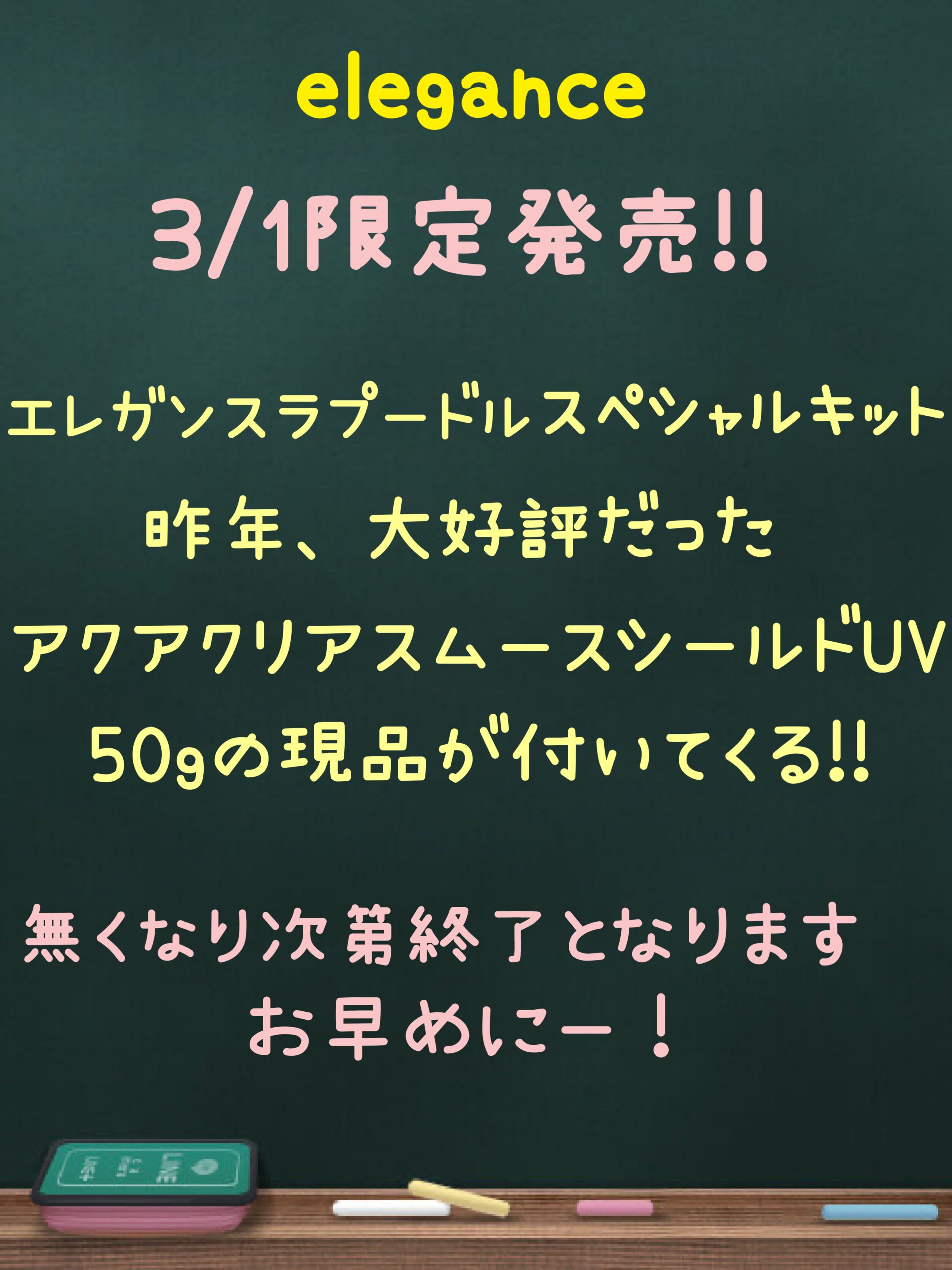 こんにちは😊 今日は暖かいですね SAKURAYA FOR ME府中店です いつもご覧いただきありがとうございます♡ 3/1限定発売 eleganceラプードルスペシャルキットのご紹介です 昨年発売で大人気だったelegance アクアクリアスムースシールドUVの 現品が付いて来るキットです♡ めちゃくちゃお得なキットです! まだご予約されてない方は、ぜひ府中店へ✨
